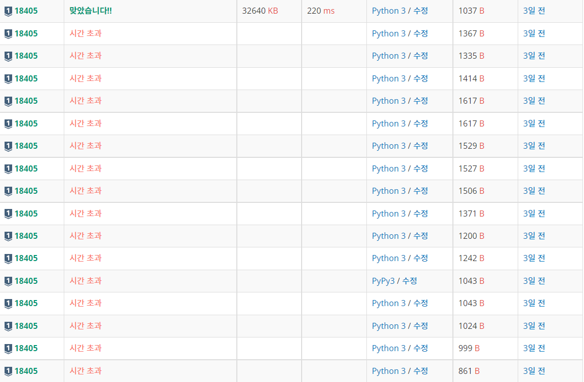 - 계속 수정을 해도 시간초과가 뜨길래, 시간초를 3초까지 줄여봤는데도 시간초과가 떴다.