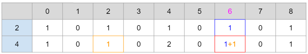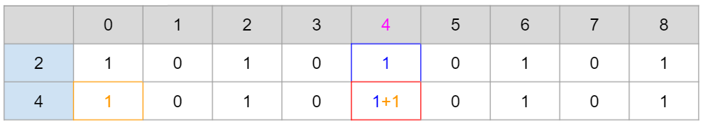 그런데 이미 2로 만들 수 있는 4의 가지수를 업데이트 해줬기 때문에(파란색) 1+1 = 2의 가지수를 가지게 된다.
