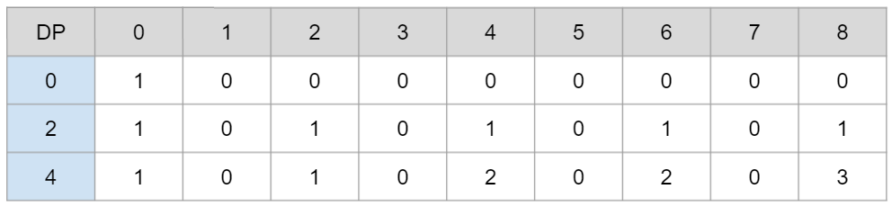 8원에서 4원을 빼고, 4원과 2원으로 만들 수 있었던 DP[4] = 2의 값(주황색)과 2원만으로 만들 수 있던값(파란색)을 모두 더해서 3가지의 경우의 수가 답으로 출력되게 된다.
