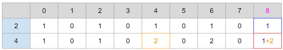 이런 식으로 2원과 4원을 모두 사용한 가지수를 DP table에 저장해줄 수 있다.